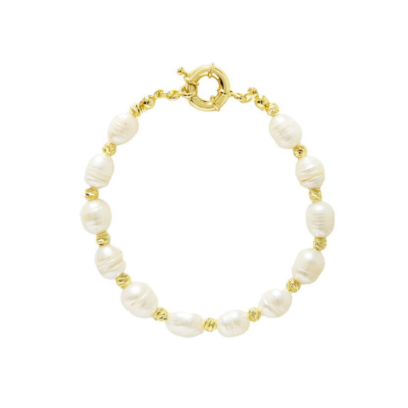 Sutil, elegante y llena de encanto natural. Esta pulsera dorada con perlas naturales es una joya que destaca por su delicadeza y autenticidad.